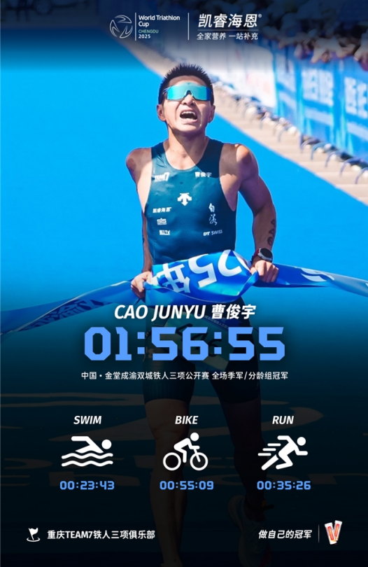 作为本次铁三公开赛的官方指定营养补给品牌,凯睿海恩携全线运动营养系列产品亮相此次大赛,并趁此机会正式官宣了品牌铁人三项推广大使——曹俊宇。作为拥有近15年铁三赛经验的资深“铁人”,近年来他在国内外多项铁三国际赛事上屡屡斩获佳绩,如2024年西班牙铁人三项世锦赛分龄组第七(中国代表队最好成绩)、2024 ICRONMAN 70.3 DESARU COAST全场冠军。在此次金堂铁三大赛上,曹俊宇也获得了分龄组冠军、全场季军的荣誉。