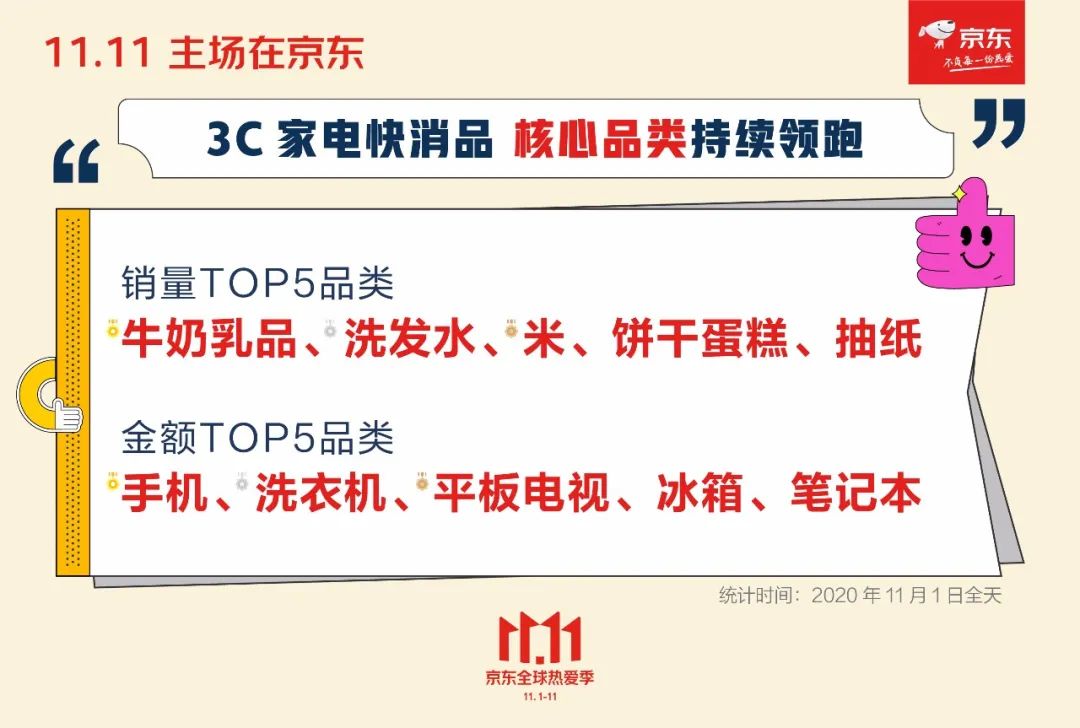 京东大数据显示,11月1日全天3C家电快消品等核心品类持续领跑全行业,时尚居家等品类高速成长。牛奶乳品、洗发水、米、饼干蛋糕、抽纸等快消类成为销量排名前五的品类,手机、洗衣机、平板电视、冰箱、笔记本等3C家电类则位于成交额排名榜首,成交额同比增长TOP品类是家居日用、美妆护肤、宠物生活、厨具、酒类,充分展现出大量用户为美好生活而消费的热情。