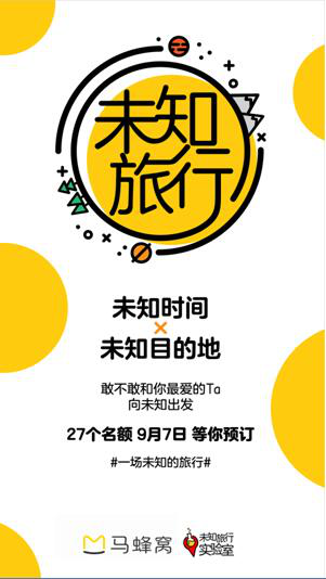 2016年9月7日零点,马蜂窝旅游微信公众号(原名:蚂蜂窝自由行)发出一条《再见了》的推送。这条类似诀别的微信,内容却是:“我要用一段未知的旅行检验未知的感情。”当细心的人们发现这篇文章的作者是“未知旅行实验室”时,马蜂窝的APP和PC页面悄然发生了改变,没有透露任何信息的“一场未知的旅行”倒计时突然上线。这一充满了前卫行为艺术的“变化”,经过一夜的发酵,成为了微博的热门话题。直到晚上8点,马蜂窝才公布了这场“未知旅行“的全部细节——这是一款神秘的双人自由行产品,价格1314元(喻意“一生一世”),限购27人,出发时间未知、旅行地点未知、旅行体验未知。