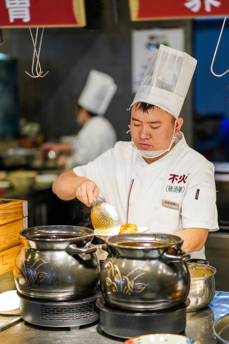 能不能创造一款既满足口味,又调养肠胃的新吃法呢?彭昊航经过仔细研究后发现,自古以来最适合中国人养胃去火的就是“粥”。但在四川,传统的粥只能称得上是稀饭,使用的粳米品质一般,而且并没有熬“开花”营养价值低,肠胃不好的人长期食用,甚至可能胃反酸引起肠胃不适。而粤式老火粥,熬煮时间过长维生素等营养大量流失。在有20多年熬粥经验名厨的帮助下,彭昊航经数百次反复试验,终于熬出“好吃料足,养胃去火”全新粥品——鱼汤粥。