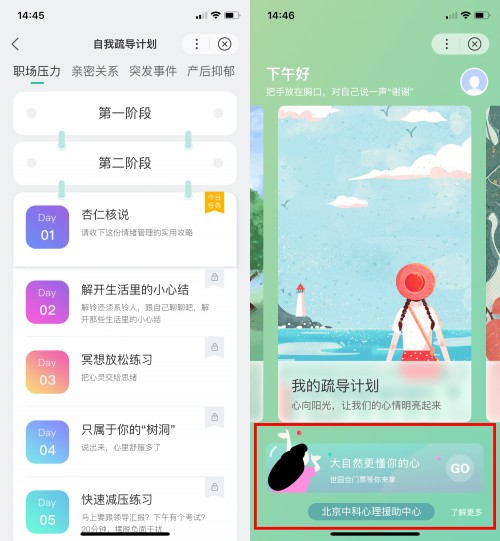 针对职场压力的情绪管理,小程序中从听、说、读、问等方面多角度地给出了专业建议,特设置了“五分钟入睡”、“十分钟高效休息”、“心坊影院”等引导小课程,给存在困扰的用户提供心理音频疏导和专业心理知识,以提升她们的自我心理认知与管理技巧,缓解焦虑心态,此外,还设有“树洞”、“辩护练习”等提问互动版块。