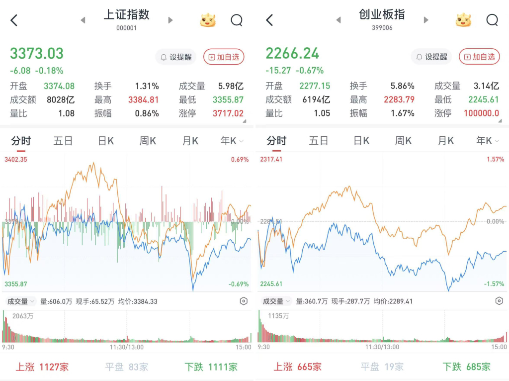 至收盘,上证综指跌0.18%,报3373.03点;科创50指数涨0.48%,报1100.05点;深证成指跌0.08%,报10983.04点;创业板指跌0.67%,报2266.24点。