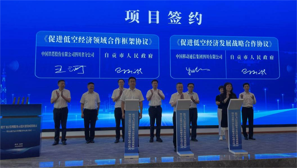 当天,自贡市人民政府与中国铁塔股份有限公司四川省公司、中国移动通信集团四川有限公司分别签署《促进低空经济领域合作框架协议》和《促进低空经济发展战略合作协议》;贡井区人民政府与中国铁塔股份有限公司自贡市分公司、中国移动通信集团四川有限公司自贡分公司共同签订《低空飞行管理服务示范区建设合作协议》。