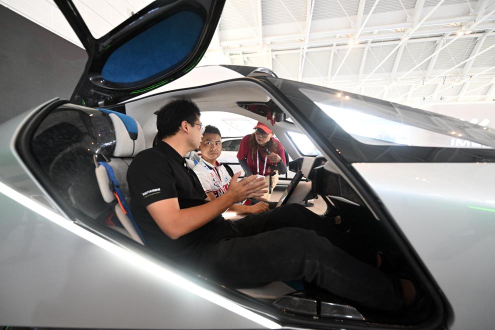 6月20日,参观者在博览会智能网联汽车展区小鹏汇天展台参观体验一台飞行器。新华社记者 赵子硕 摄