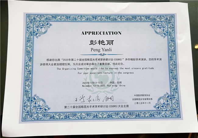 聚焦前沿,共促发展,2025年11月13日—16日,由中国医药教育协会主办,云南大学附属医院、全国眼屈光专家俱乐部协办的2025年第二十届全国眼屈光手术学术研讨会(CSORS)在昆明盛大召开,本次会议汇聚了国内知名眼科专家,就屈光手术的新技术、新知识以及新的经验做专题报告,探讨眼科医学的最新进展和未来趋势。重庆普瑞眼科医院院长彭艳丽教授受邀参会,以多项学术分享及导师职责,与众多眼科同仁共探前沿,共促发展。