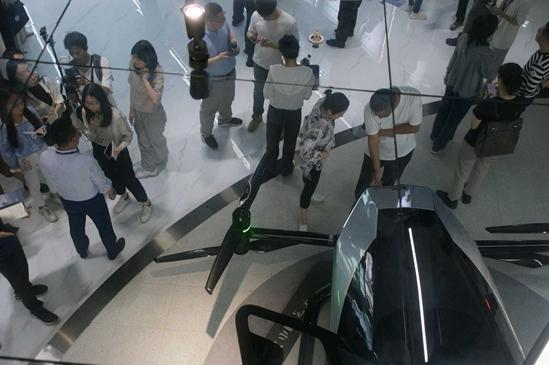 5月15日,广东省广州市,小鹏汇天广州研发中心,“高质量发展调研行”主题采访活动现场。记者在研发中心展示区域参观飞行器、采访企业负责人。本组照片均由田嘉硕摄